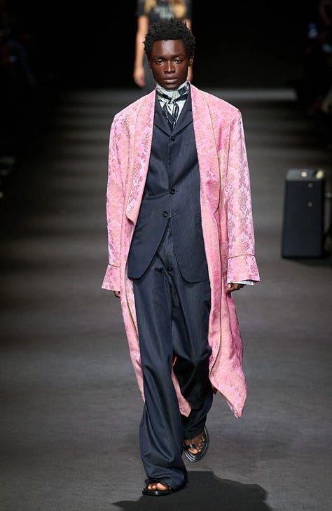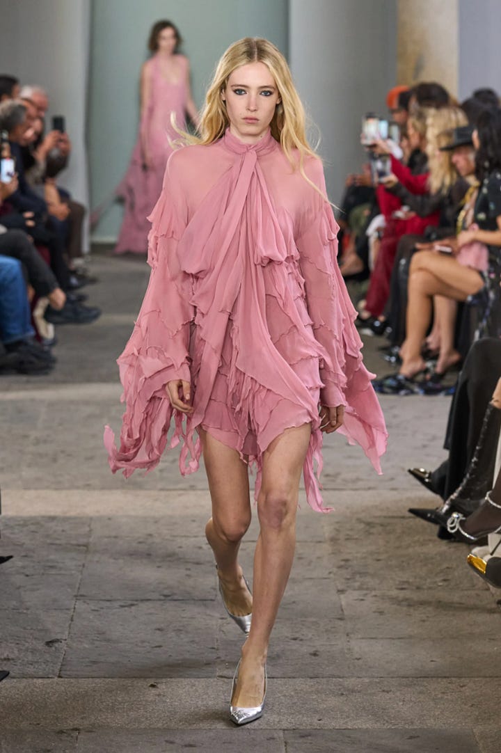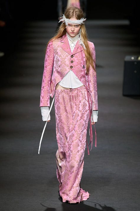 Across these three pieces, however, the pink reads as structured, as the tailoring and repetition to give the color authority rather than softness. Control is no longer decorative but worn as uniform.