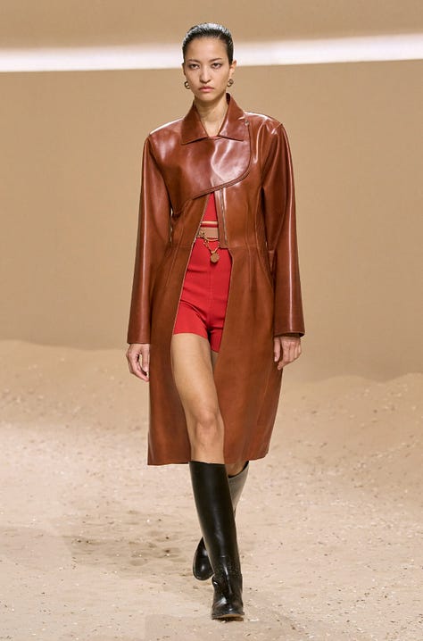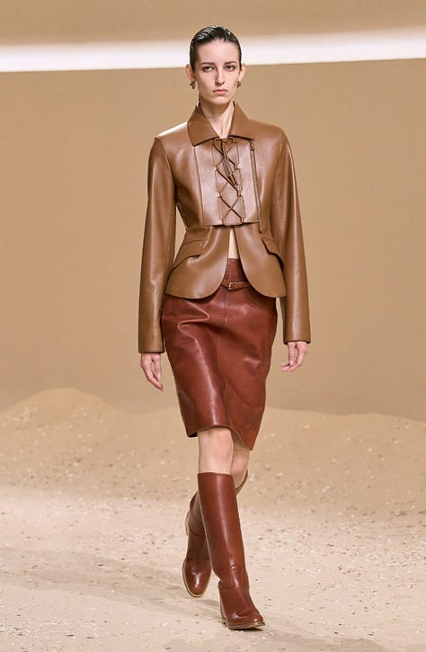 The glossy reddish-brown leather in these three Hermès Spring 2026 pieces feels polished yet grounded, balancing heritage craftsmanship with a modern, sculptural tactility.