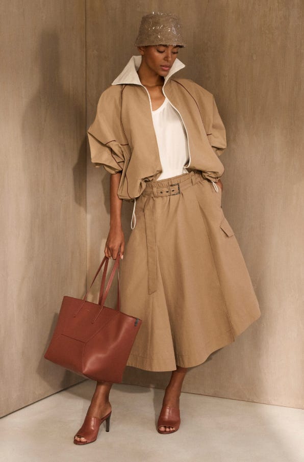 And in these two Brunello Cucinelli’s Spring 2026 looks, the gingerbread shade in combination with the taupe tones feel soft and breathable. Natural materiality, ease, and understated warmth.
