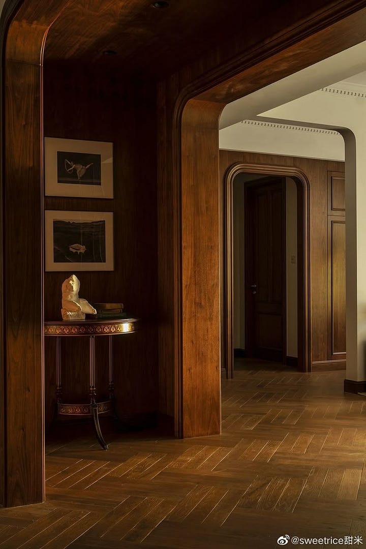And in these two interiors, gingerbread takes on a sleeker, more architectural role. Here, warm brown leather, wood-paneled walls, and deep cocoa accents replace ornament with material-driven impact.